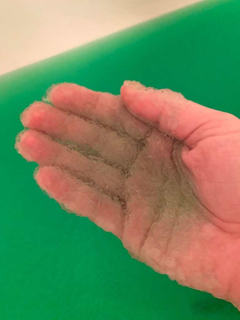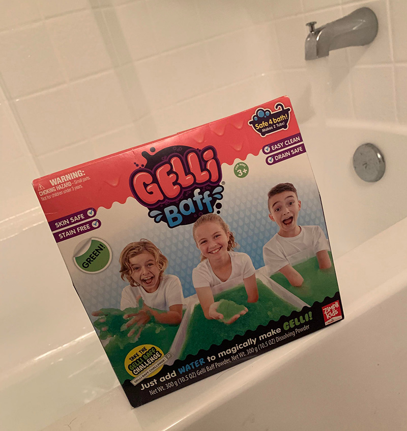 Zoe has been begging me to Gelli Baff for weeks. I kept imaging it would be like slime- the bane of existence and plague of carpets or anything fabric I love in my house. After actually reading the box though, I decided to give it a try and see if the clean-up process was truly as simple as they claimed. The product comes with 2 servings of Gelli Baff and claims it will make a jelly-like Slime in a small amount of bathwater that is fun, safe, not toxic, and easy to clean. We filled the tub up just about 2” of water and added the green powder. After stirring, we let the mixture sit and saw the thin water solidify almost instantly. Together, we dug through the bath-water-now-turned- muck, just laughing at the oddity of it. We then added a bit more water as instructed which gave it a smoother, slimier texture before my daughter jumped in to play. She had a blast and her attention was held for maybe an hour before reckoning was finally near. The clean-up process started by adding Step Two, a white powder that was to be mixed in the slime and resulted with it once again becoming more of a liquid. There was still some spotty, Slime texture to the water, but once I removed the drain and splashed some cold water down the tub, Gelli Baff was gone! Pleasantly surprised by the level of fun we received as well and the simplicity of clean-up.